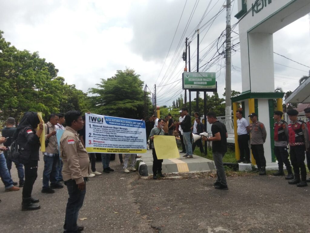 VisualJambi, Merangin. – Puluhan jurnalis yang tergabung dalam Ikatan Wartawan Online Indonesia (IWOI) Kabupaten Merangin menggelar aksi damai di depan Kantor Kejaksaan Negeri Merangin, Senin (13/4).