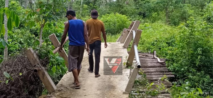 Agus, menunjukkan lokasi jembatan seraya menyampaikan “Cobalah abang cek kondisi jembatan ini, tiang penyangga aja bergantung pada jembatan kayu yang lama.
