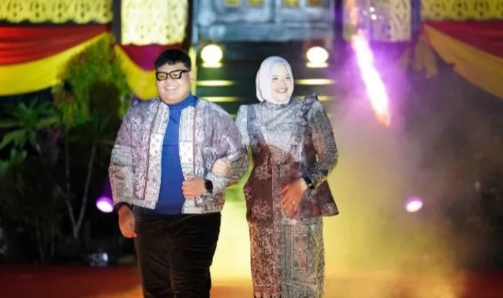 Sementara itu, putranya mengenakan busana bermodel outer dengan motif pohon pedade dan ikan toman, yang melambangkan kekayaan alam pesisir dan perairan Kabupaten Tanjung Jabung Timur.