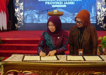 Visual, Jambi. - Ketua Dewan Kerajinan Nasional Daerah (Dekranasda) Provinsi Jambi, Hj. Hesnidar Haris, SE (Hesti Haris), menjalin kerja sama...