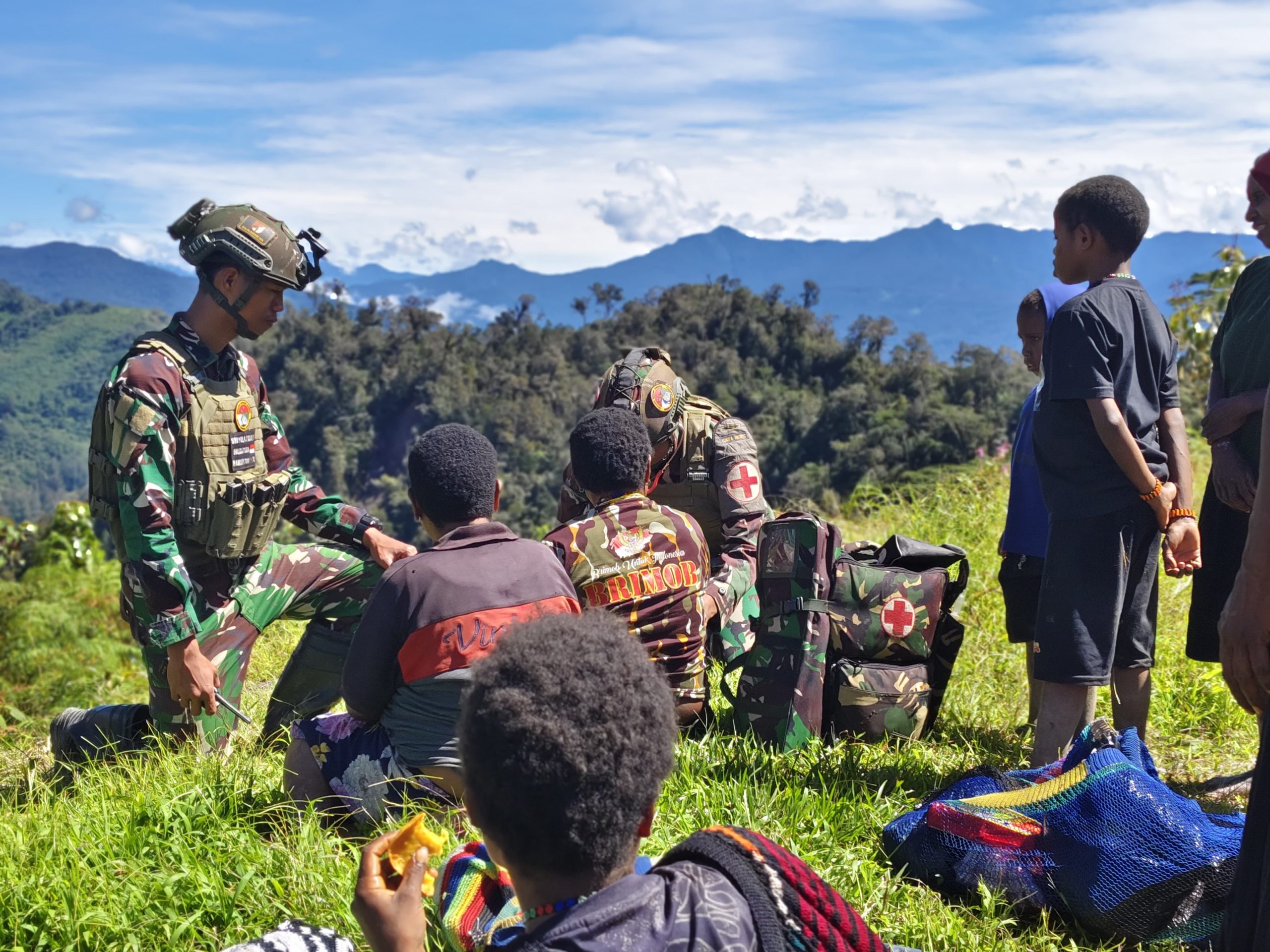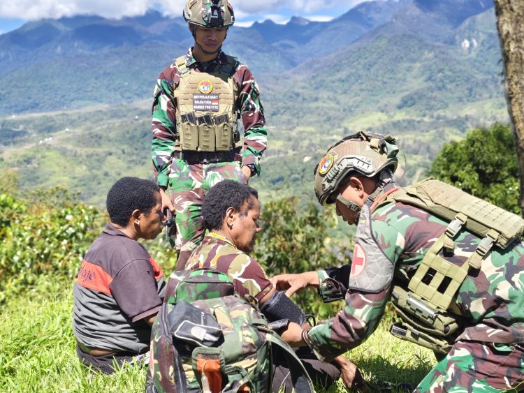 VisuaJambi, Puncak. — Langit biru membentang tenang di atas pegunungan Pintu Jawa, Kabupaten Puncak Papua, (26 Juli 2025), di bawah teduhnya awan dan sejuknya angin, hadir sekelompok prajurit berbaju loreng, bukan dengan senjata di tangan, melainkan dengan perban, stetoskop, dan hati yang tulus.