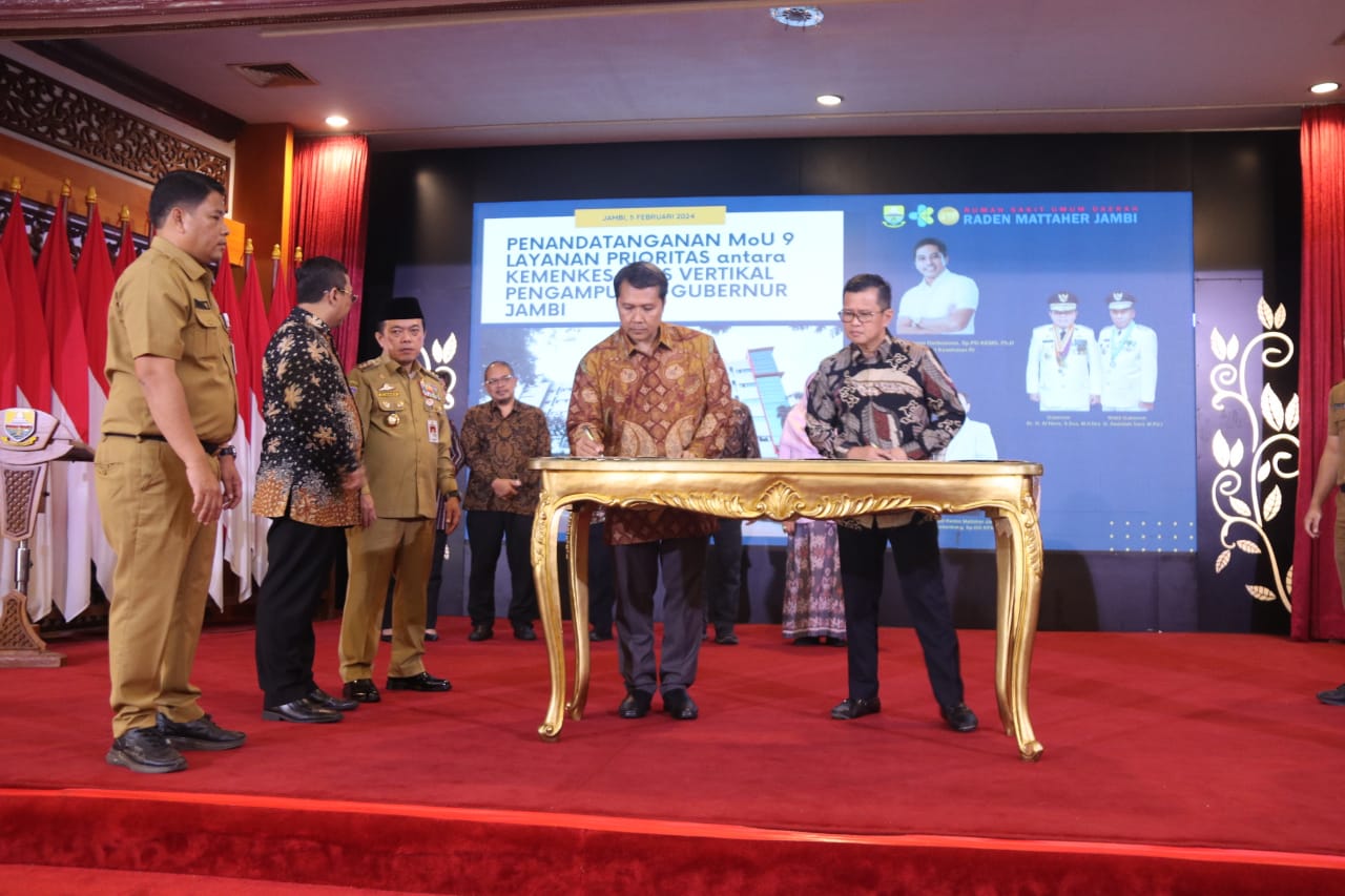 VisualJambi, Kota Jambi. – Gubernur Jambi Dr. H. Al Haris, S.Sos, MH menandatangani Memorandum of Understanding (MoU)/Nota Kesepahaman dengan Pimpinan Rumah Sakit Pengampu terkait Pengampuan 9 Layanan Prioritas Program Kementerian Kesehatan di Rumah Sakit Umum Daerah (RSUD) Raden Mattaher Jambi, bertempat di Auditorium Rumah Dinas Gubernur Jambi, Senin (05/02/2024).