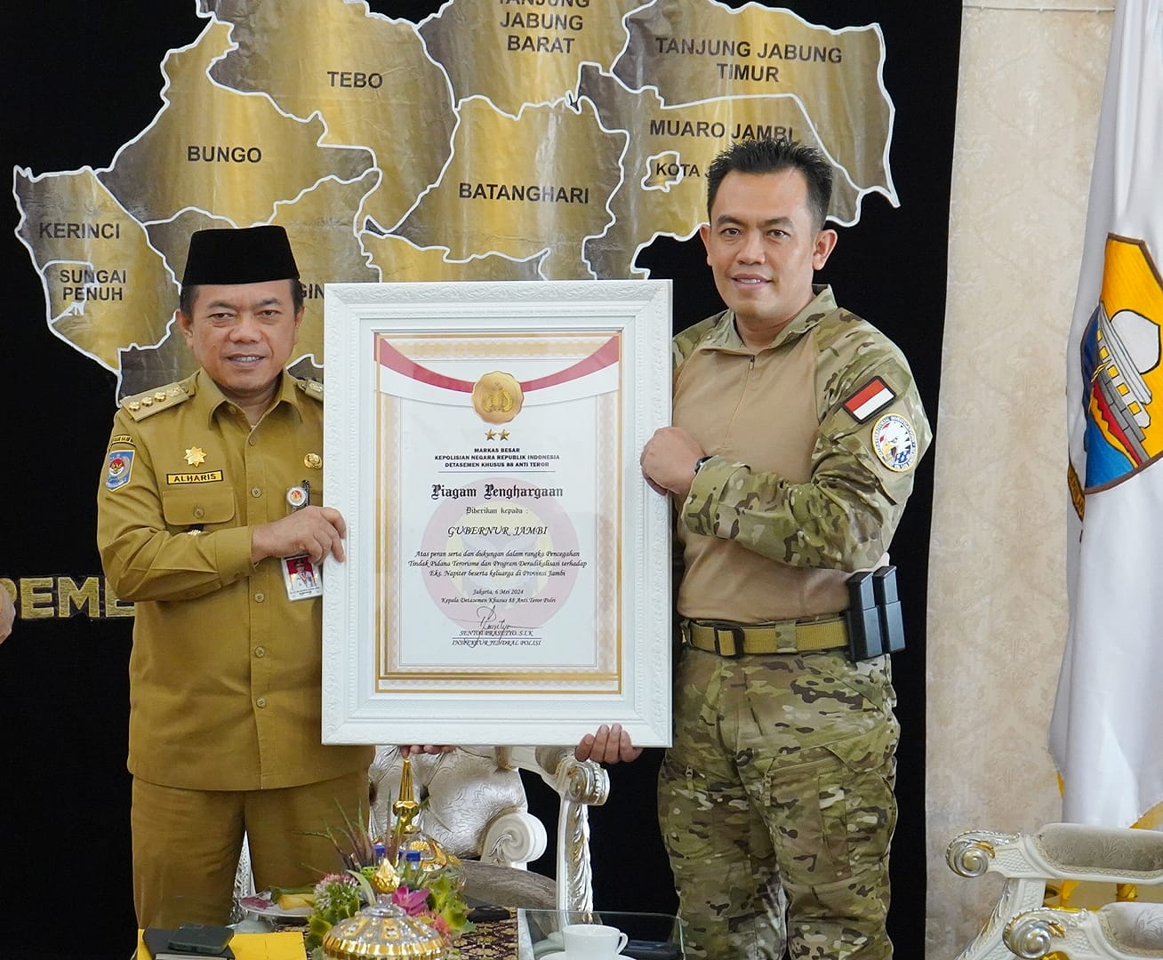 Penghargaan tersebut diberikan Densus 88 kepada Gubernur Al Haris atas peran serta dan dukungan dalam rangka pencegahan tindak pidana terorisme dan program deradikalisasi terhadap eks Napiter beserta keluarga di Provinsi Jambi.