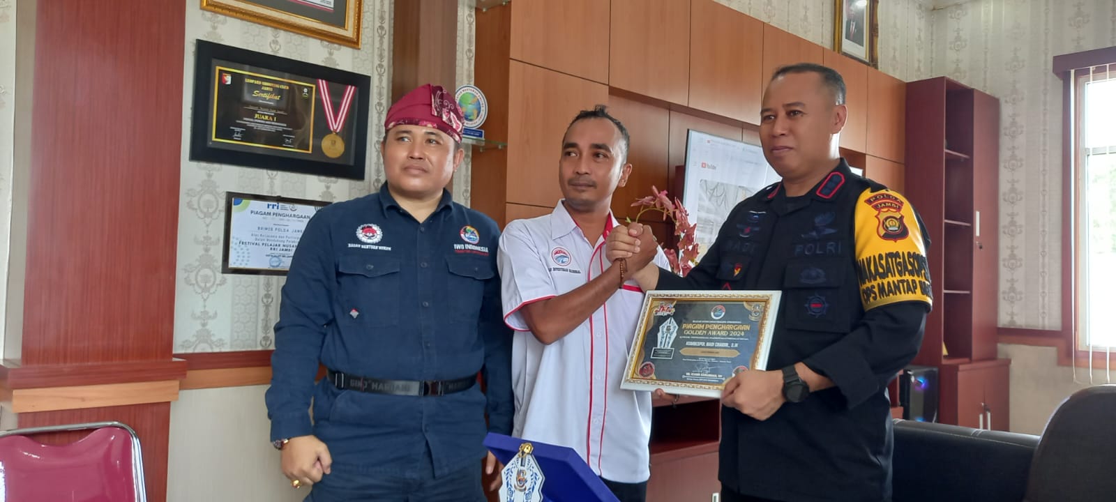 Kunjungan disambut hangat oleh Komandan Satuan Brimob Polda Jambi Kombes Pol Nadi Chaidir, S.IK., MH di ruang kerjanya. Tujuan kunjungan silaturahmi ini adalah untuk membina hubungan baik antar institusi negara dengan Organisasi Profesi IWO INDONESIA yang perlu terus dijaga dan dibina. Kunjungan silaturahmi ini sekaligus memberikan penghargaan berupa piagam dan plakat IWO INDONESIA GOLDEN AWARD 2024 kepada SATBRIMOB Polda Jambi.