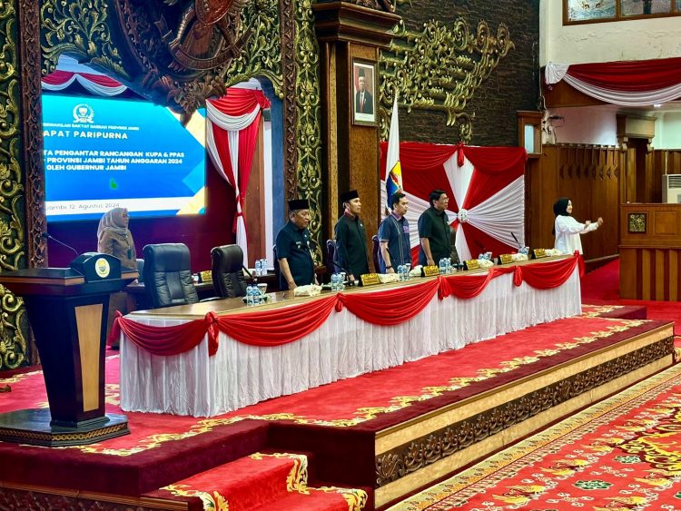 Visualjambi, Kota Jambi. – DPRD Provinsi Jambi menggelar rapat paripurna dengan agenda Penyampaian Nota Pengantar Rancangan KUPA dan PPAS Perubahan APBD Provinsi Jambi Tahun Anggaran 2024 oleh Gubernur Jambi, Senin (12/8). Rapat paripurna ini dipimpin oleh Ketua DPRD Provinsi Jambi, Edi Purwanto didampingi oleh Wakil Ketua DPRD Provinsi Jambi, Faisal Riza, dan Burhanuddin Mahir.