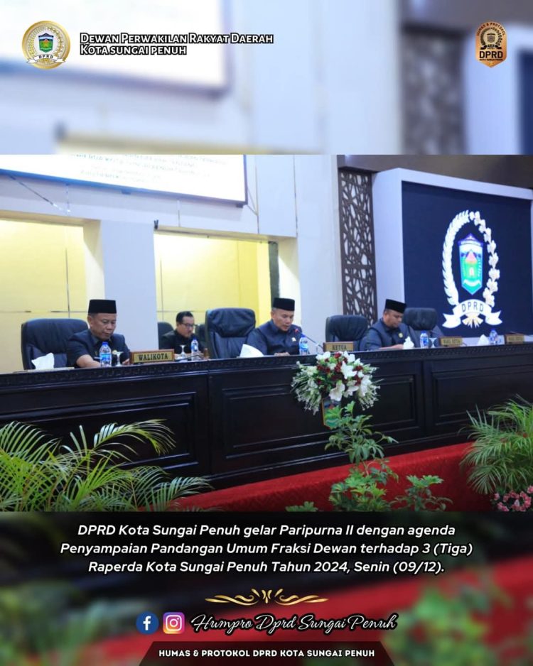 VisualJambi, SUNGAI PENUH – DPRD Kota Sungai Penuh gelar Paripurna II dengan agenda Penyampaian Pandangan Umum Fraksi Dewan terhadap 3 (Tiga) Raperda Kota Sungai Penuh Tahun 2024, Senin (09/12).