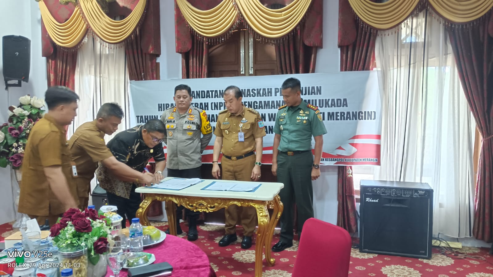 ‘’Perjanjian hibah daerah ini dalam rangka pemenuhan kewajiban Pemerintah Kabupaten Merangin untuk membiayai kegiatan pengamanan pemilihan bupati dan wakil bupati Merangin tahun 2024,’’ujar Pj Bupati.