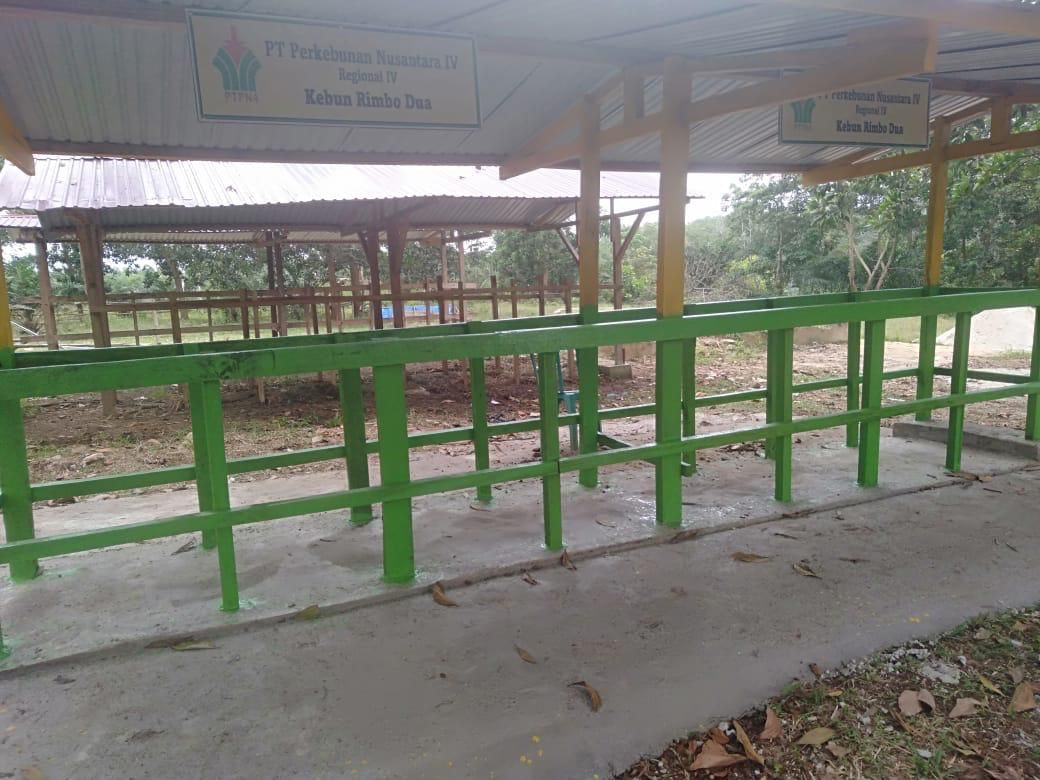 VisualJambi, Tebo. – Untuk menggerakkan dan meningkatkan perekonomian masyarakat desa dengan transaksi jual beli yang nyaman dan bersih, PT Perkebunan Nusantara (PTPN) IV Regional 4 Jambi yang diwakili oleh Kebun Usaha Rimbo Dua di Kabupaten Tebo Provinsi Jambi bangun dua unit lapak ternak di Pasar Ternak Kalangan Kedung Berkah yang dikelola dan milik Badan Usaha Milik Desa (BUMDES) Mulya Kencana.