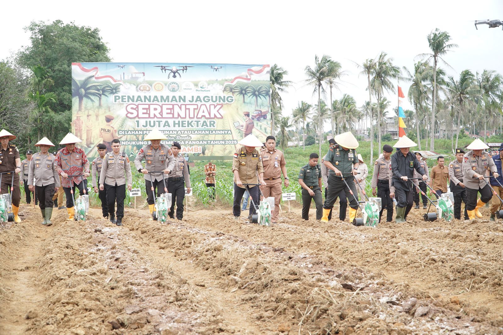 Tanam jagung perdana ini, dipusatkan di lahan perkebunan kelompok Tani Tunas Jaya RT 15 kelurahan Paal Lima, kota Jambi, dihadiri Gubenur Jambi, DR Al Haris SSos MH, Kapolda Jambi Irjen Rusdi Hartono, Danrem 042/Gapu Brigjen Heri Purwanto, Perwakilan Kejati, Kepala BNN, Kepala BIN, Senior Executive Vice Presiden (SEVP) Business Suport PTPN IV Regional 4 Ifri Handi Lubis, SEVP Operation Achmedi Akbar, dan Wakapolda Jambi Brigjen Edi Mardianto.