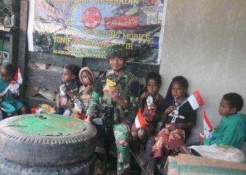 Visualjambi, Kago. - Anak anak pedalaman kampung Kago distrik Ilaga, Kabupaten Puncak, Papua Tengah, bermain bersama personel pos Kosatgas Satgas ...