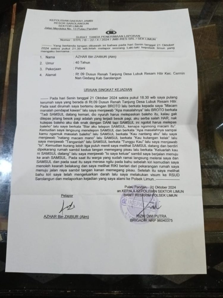 Terkait tindak pidana penikaman Azhar telah dua kali dilaporkan ke aparat kepolisian wilayah setempat yakni ke Polsek Limun pada 21 Oktober 2024 dan piket Reskrim Polres Sarolangun pada 12 November 2024. Mirisnya, hingga saat ini tidak ada upaya Korps Bhangkara tersebut untuk menangkap pelaku penikaman.