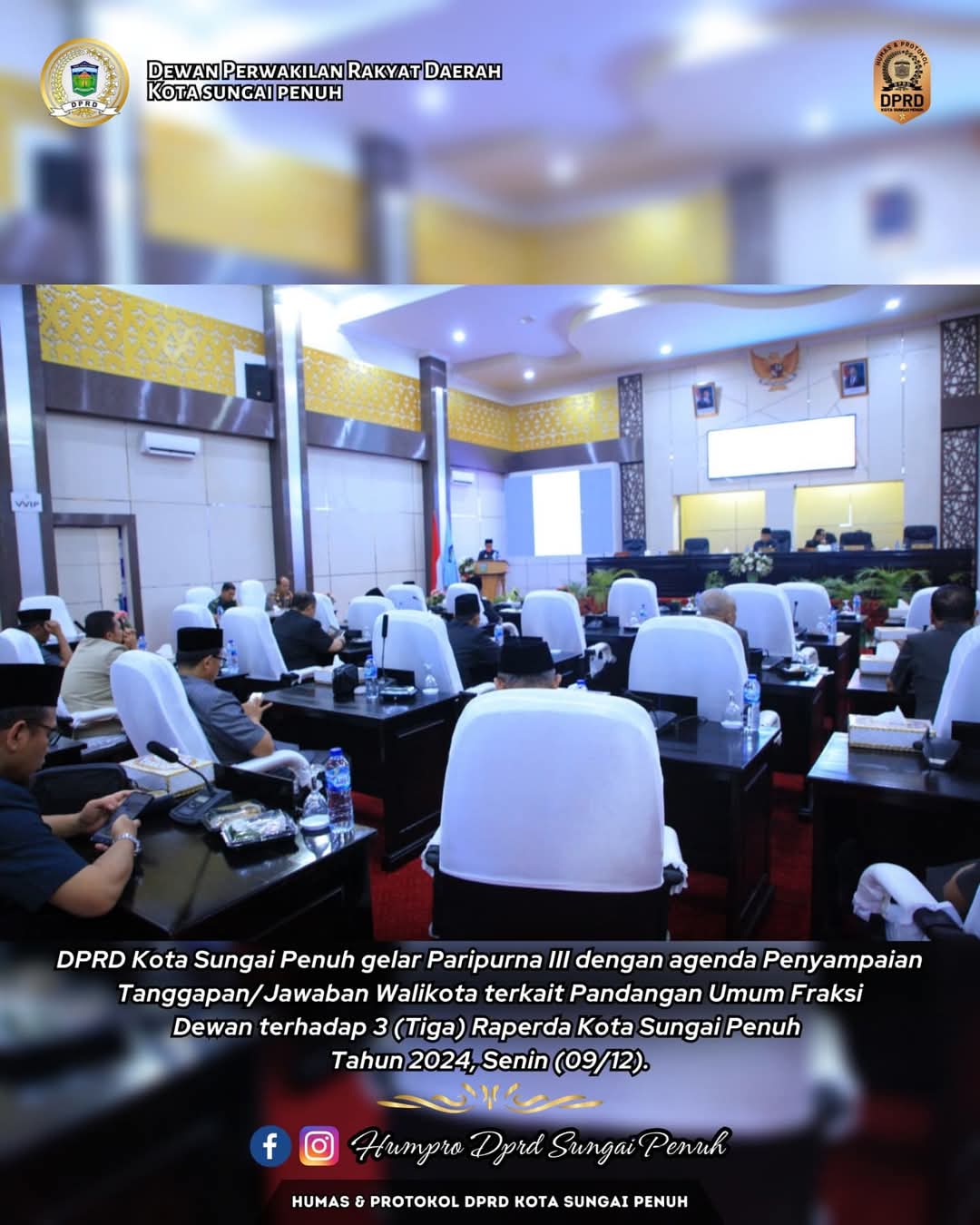 VisualJambi, SUNGAI PENUH – DPRD Kota Sungai Penuh gelar Paripurna III dengan agenda Penyampaian Tanggapan/Jawaban Walikota terkait Pandangan Umum Fraksi Dewan terhadap 3 (Tiga) Raperda Kota Sungai Penuh Tahun 2024, Senin (09/12).