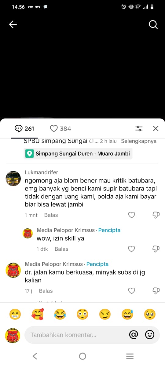 Akun tiktok itu berasal @Lukmandrifer bernada mengomentari, “ngomong aja blom bener mau kritik batubara, emg banyak yg benci kami supir batubara tapi tidak dengan uang kami, “polda aja kami bayar biar bisa lewat jambi”, senin 28 Oktober 2024.